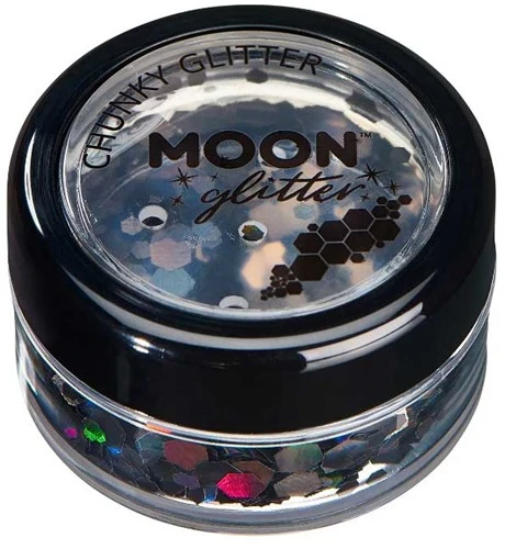 De chuncky glitters van Moon Creations zijn grove glitters van verschillende grootte door elkaar gemixt. De holografische festival glitters schitteren in het licht en voegen regenboog effecten toe aan elk geschminkt gezicht. Deze festival glitters worden veel gebruikt met carnaval, op festivals, voor een feestelijke make up maar ook voor bodypaint of in het haar is het effect super mooi.