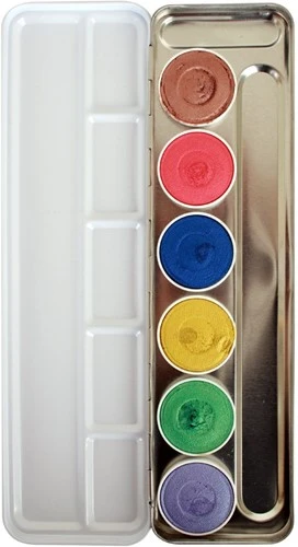 De matte kleuren zijn uitermate geschikt voor het schminken van de basis en het zetten van lijnen. De glanzende Shimmer kleuren schmink zijn wat zachter en daarom zeer geschikt voor het schminken van de basis van je creaties. Omdat de shimmer kleuren wat zachter zijn, heb je weinig water nodig om de schmink te activeren.
